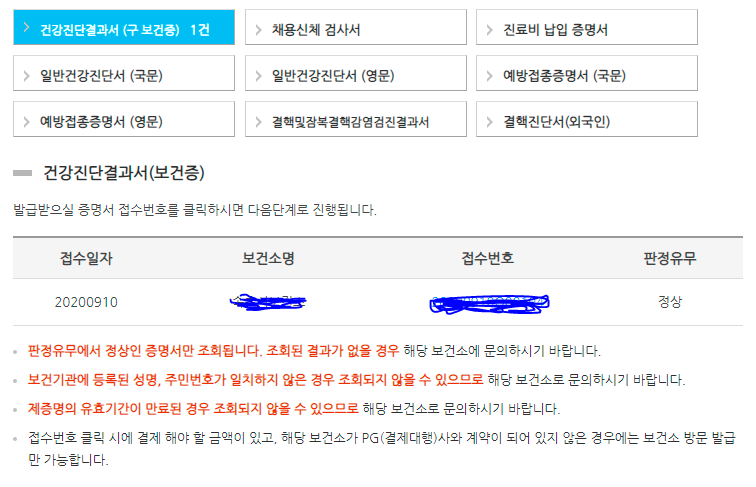 밑에 유의사항에 쓰여있듯이 정상 판정만 조회, 출력이 가능합니다!