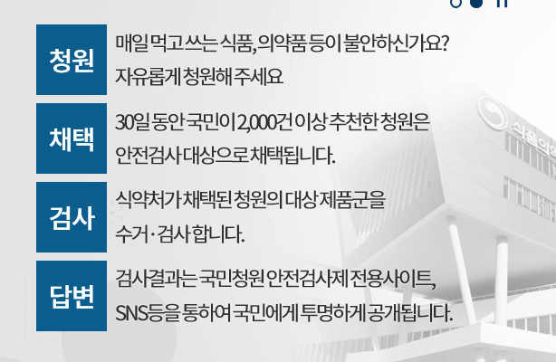 국민이 청원하고 다수가 추천한 식품, 가공식품, 건강기능식품, 식품첨가물, 위생용품 및 의약품, 의약외품, 화장품, 의료기기 등의 안전에 대하여 검사 및 결과를 공개합니다.