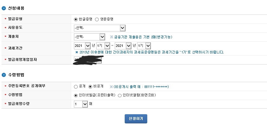 저희는 인터넷 발급이므로 신청하기를 눌러주시고
