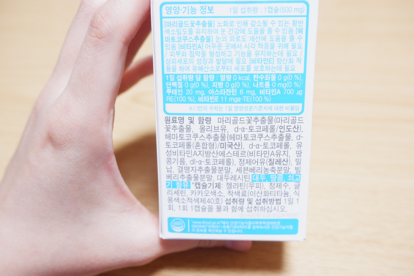 1. 식약처 1일 권장 최대치인 루테인 20mg , 아스타잔틴은 6mg 이 함유되어 있어요.